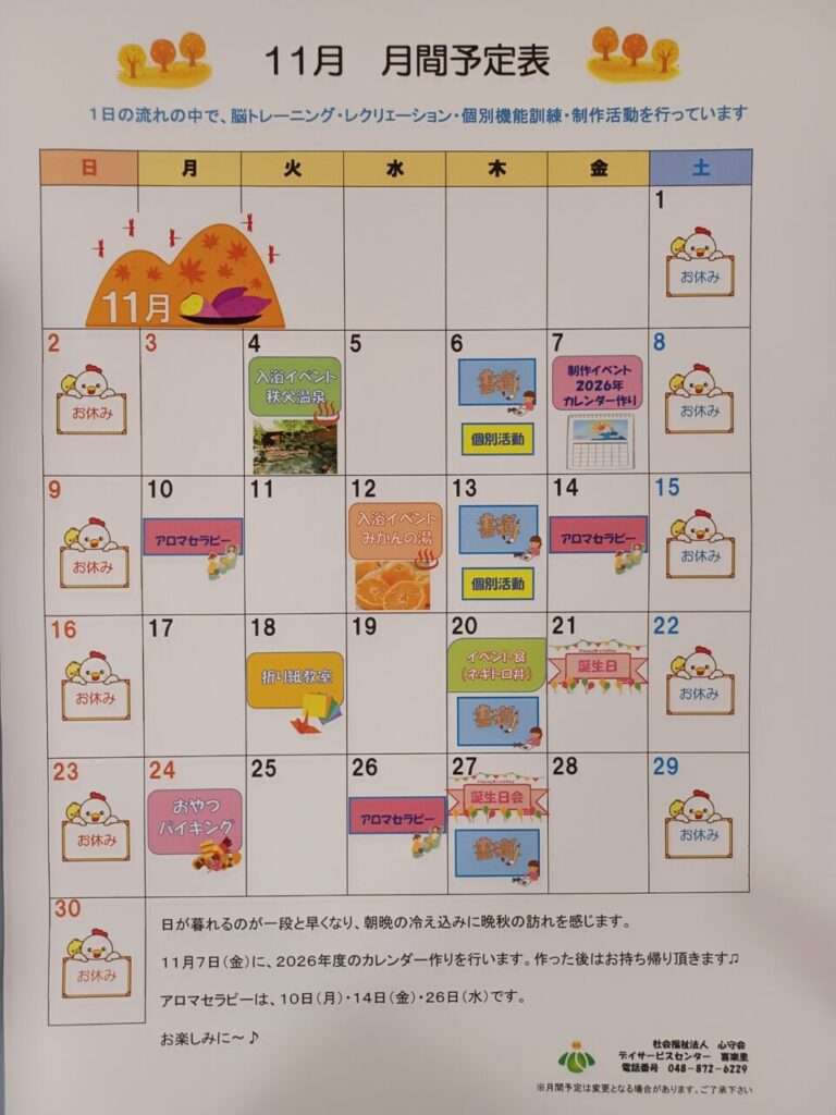 11月の月間予定表も出来上がりました‼
