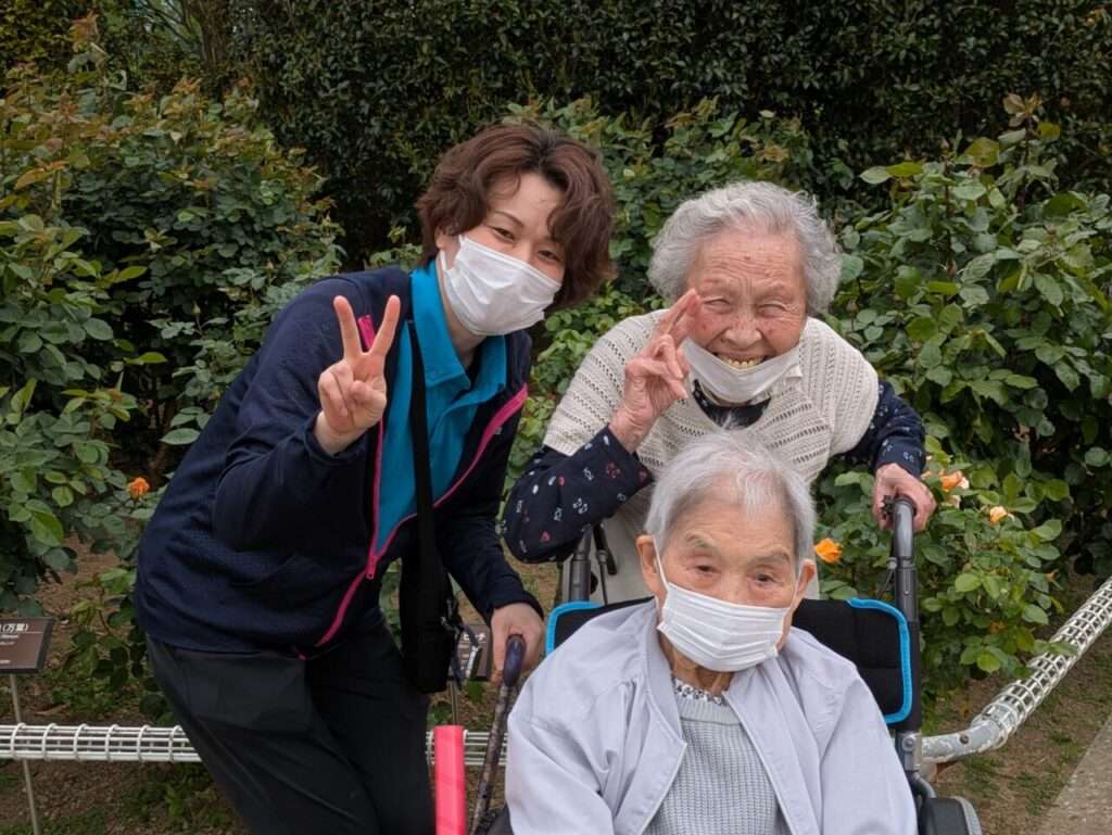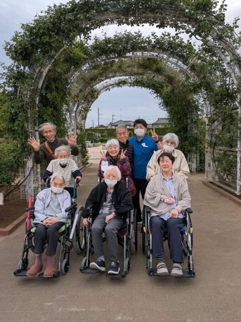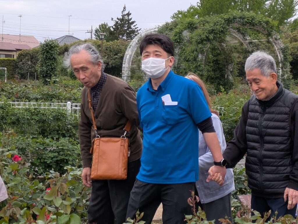 外の空気とバラに囲まれて、皆さんいい笑顔です!