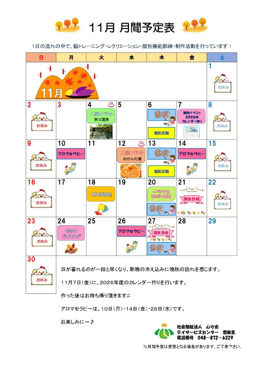 デイサービスセンター 喜楽里令和7年11月の月間予定表をアップしました!2025.11.01デイサービスセンター「喜楽里」の令和7年11月の月間予定表をアップしました。 毎月恒例のアロマセラピーや入浴イベントのほか、11月7日には来年のカレンダー作りを予定しています。 皆さまのご利用をお待ちしております!※画像をクリック(タップ)すると拡大してご覧いただけます