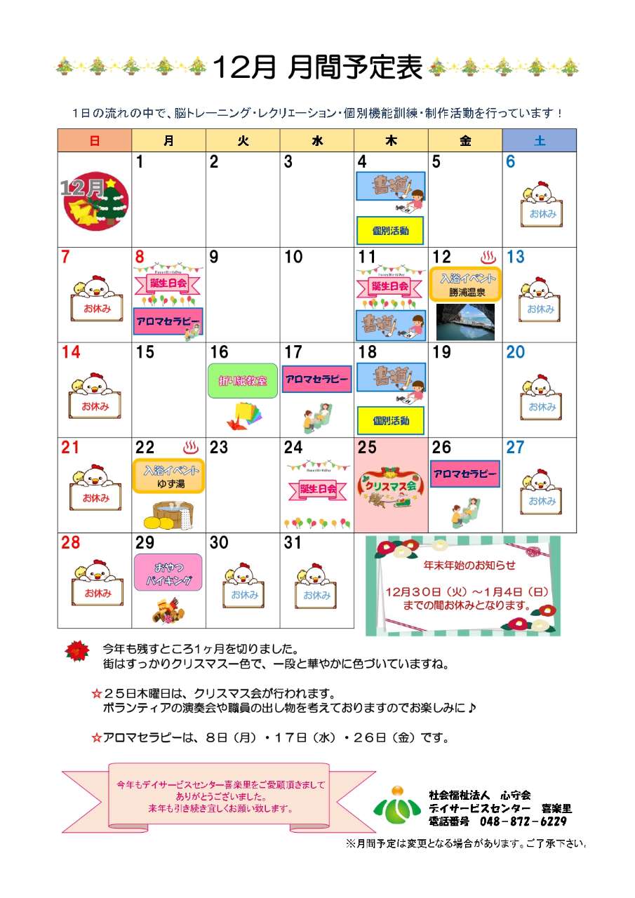 デイサービスセンター 喜楽里令和7年12月の月間予定表をアップしました!2025.11.28デイサービスセンター「喜楽里」の令和7年12月の月間予定表をアップしました。 今年も残すところあと1ヶ月。12月も毎月恒例のアロマセラピーや入浴イベント、誕生日会がございます。 また、12月25日にはクリスマス会を予定しています。皆さまのご利用をお待ちしております!※画像をクリック(タップ)すると拡大してご覧いただけます